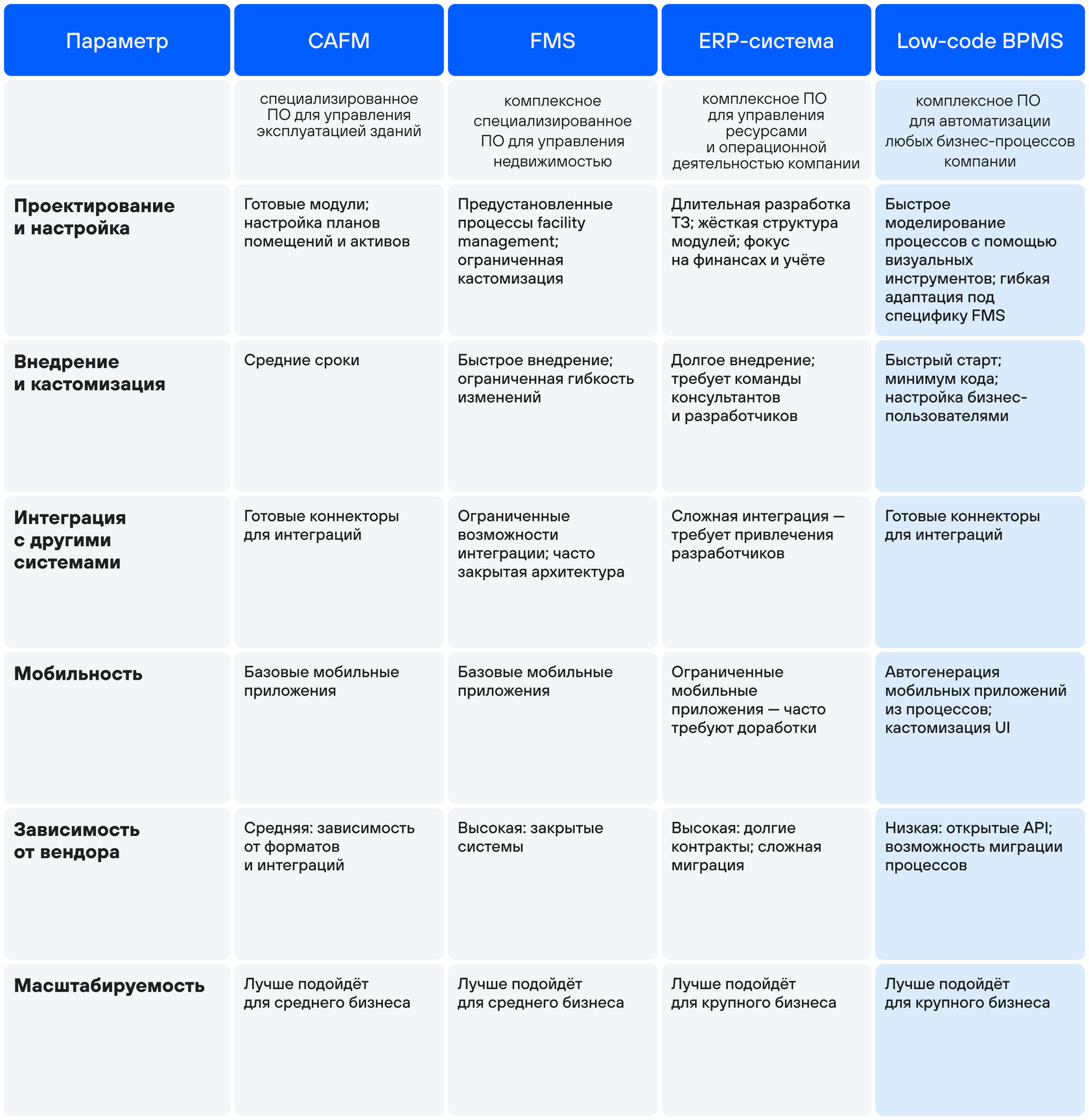 CAFM, FMS, ERP, BPMS: сравниваем решения для автоматизации