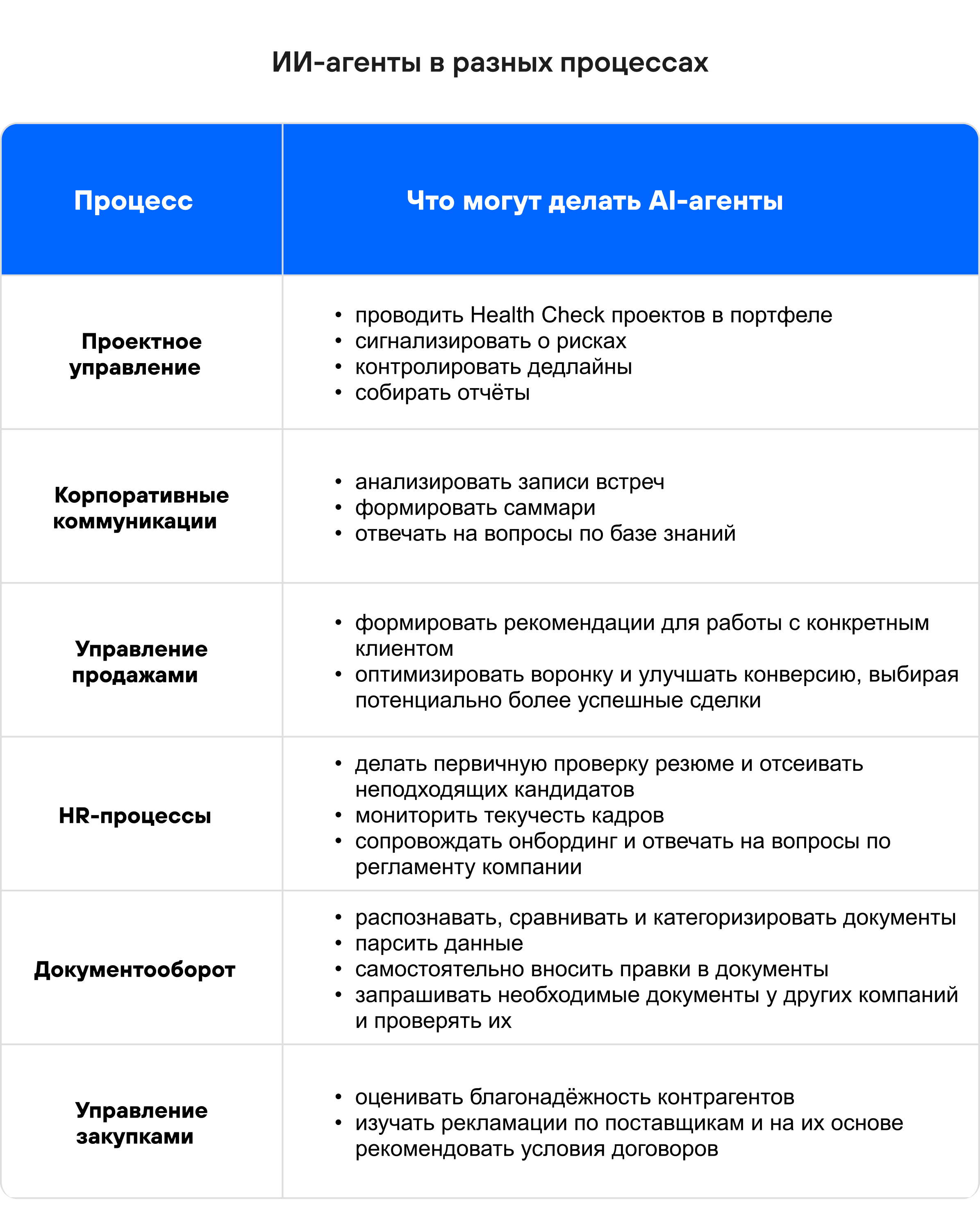 Давайте рассмотрим несколько примеров возможностей ИИ-агентов в разных бизнес-процессах, которые может настроить команда «Первой Формы»: