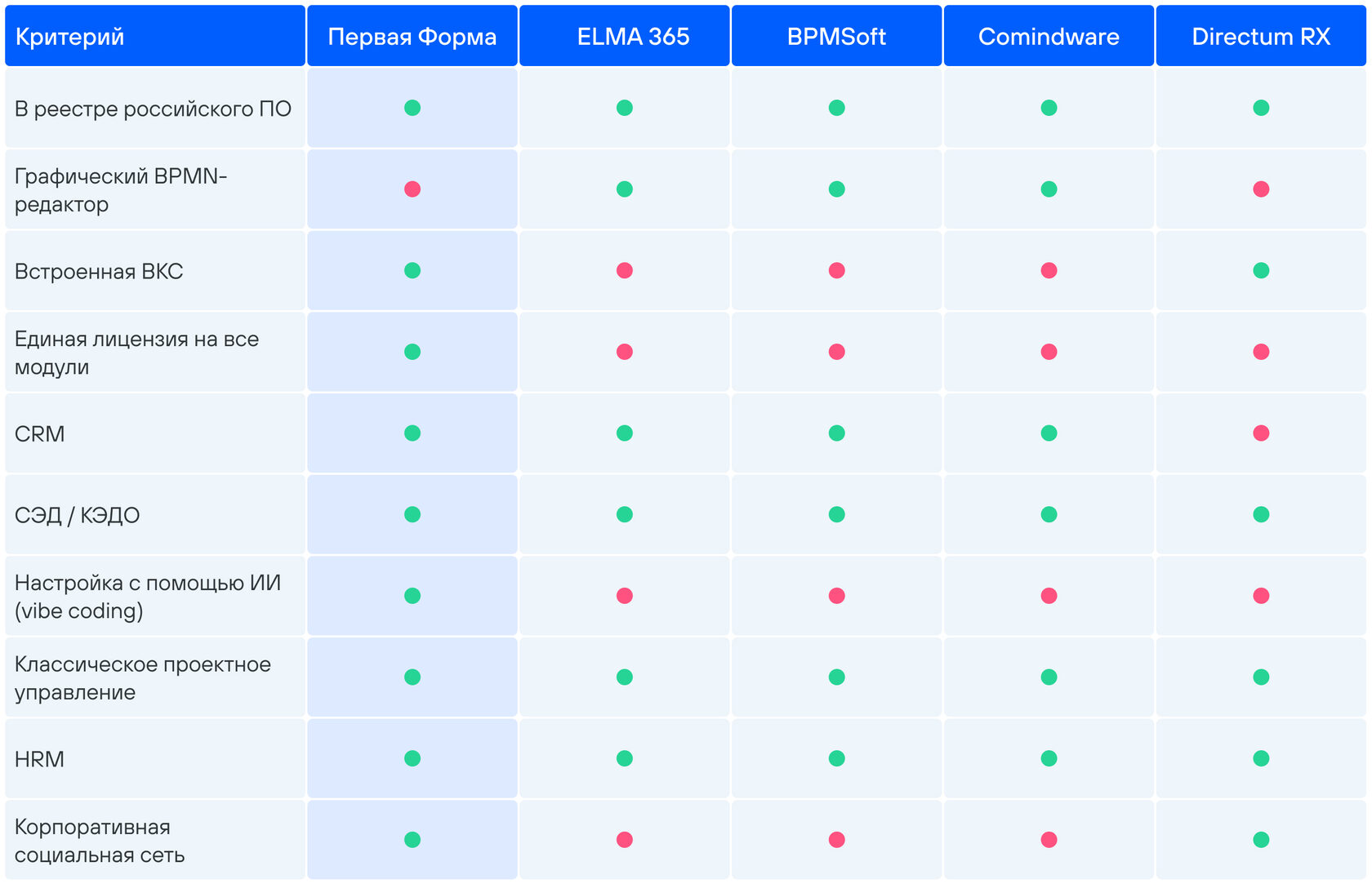 В 2025 году «Первая Форма» вошла в топ-3 BPM-систем на российском рынке. Компания настраивает любые бизнес-процессы под запросы клиентов — от корпоративных коммуникаций, управления проектами, CRM и SRM до КЭДО и HR-процессов.