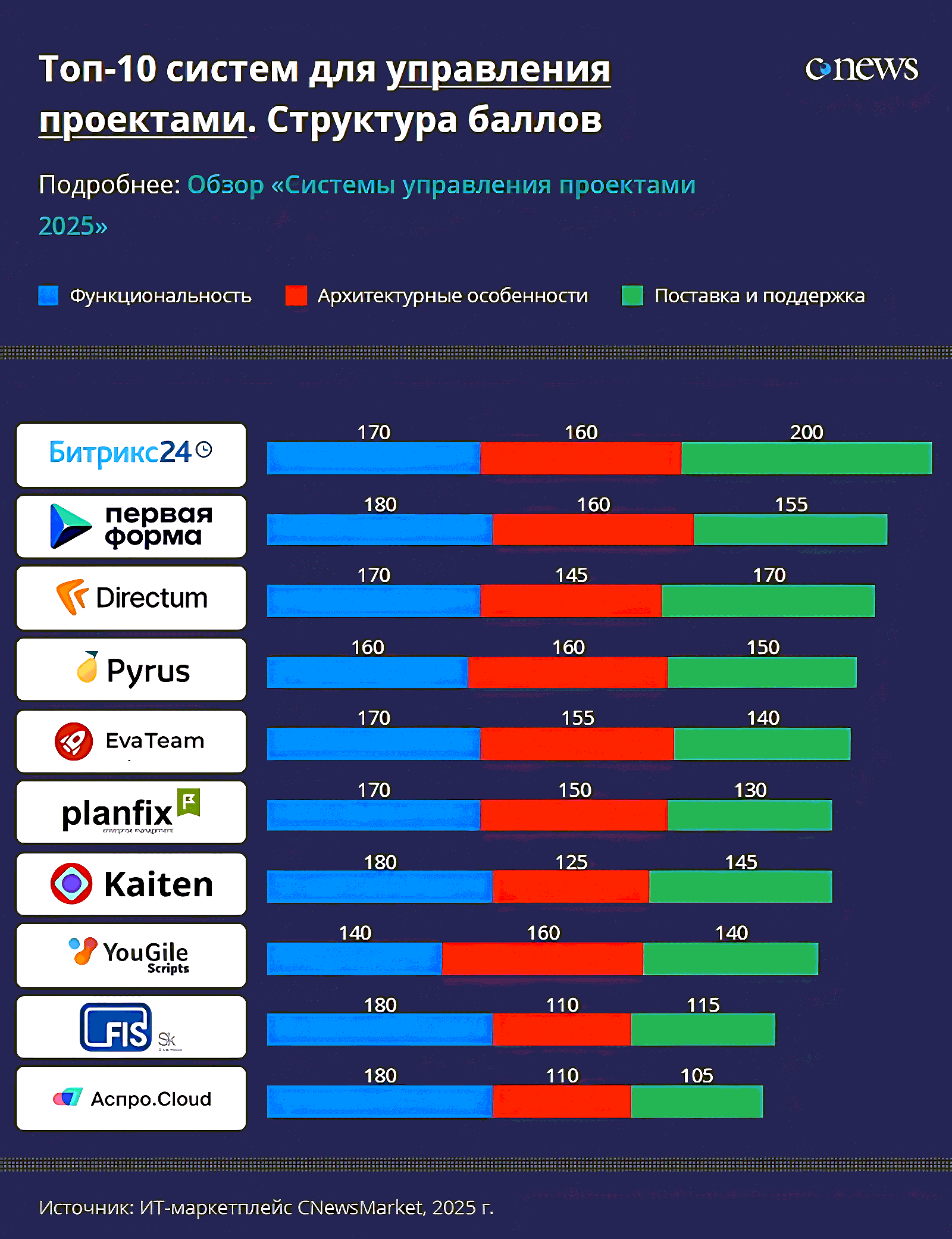 CNewsMarket выпустил рейтинг систем для управления проектами, в котором сравнил возможности планирования, контроля этапов работ и управления информацией о ресурсах разных решений. «Первая Форма» заняла вторую строчку — система получила наибольшее количество баллов по функциональности и архитектурным решениям.